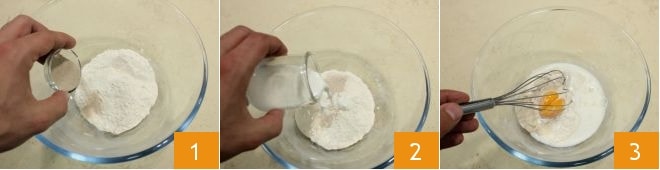 Para preparar o pandoro com leite condensado e gotas de chocolate, comece pelo fermento: em uma tigela misture a farinha peneirada, o fermento desidratado 1 (se usar fermento fresco, pode usar 15 g dissolvidos no leite morno); depois adicione o leite morno 2 e uma gema, então misture com o batedor 3