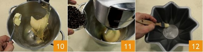 Quando a massa estiver homogênea e se soltar das laterais, substitua a pá pelo gancho, deixe a batedeira funcionando por alguns minutos, depois adicione a manteiga amolecida, um pedaço de cada vez, esperando que o pedaço anterior seja incorporado antes de prosseguir com o próximo 10. Quando toda a manteiga estiver incorporada, adicione as gotas de chocolate 11. Pegue a forma de pandoro com capacidade de 750 g e unte-a cuidadosamente 12.