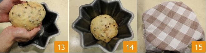 Despeje a massa sobre uma superfície de trabalho levemente untada com manteiga, trabalhe-a para dar forma de bola e coloque-a na forma de pandoro (13-14); cubra com um pano limpo 15 e deixe fermentar até atingir a borda da forma (o que levará cerca de 6 horas).