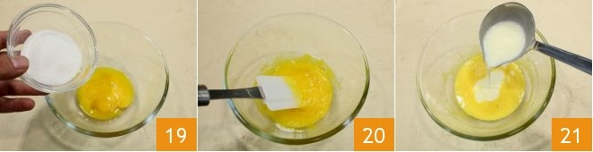 Em uma tigelinha, coloque as gemas, adicione o açúcar 19 e misture até formar um creme 20, em seguida adicione o creme de leite com o leite condensado aquecidos anteriormente 21