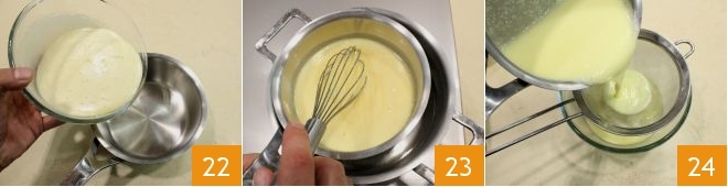 depois leve a mistura de volta à panela onde aqueceu o creme de leite e o leite condensado 22 e coloque a panela em banho-maria, tomando cuidado para que a água da panela maior não toque o fundo da panelinha onde colocou o creme; misture com um batedor de mão 23 e leve o creme a 83° medindo a temperatura exata com um termômetro de cozinha. Então desligue o fogo e passe o creme por uma peneira para eliminar grumos e resíduos da fava de baunilha 24.