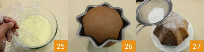 Cubra com filme plástico em contato direto 25 e deixe esfriar em temperatura ambiente, depois coloque na geladeira até o momento de usar. Quando o pandoro estiver fermentado, coloque-o no forno para assar: coloque uma tigela cheia de água no forno na parte mais baixa, depois asse o pandoro em forno estático pré-aquecido a 170° por 55 minutos. Antes de retirar do forno verifique a cocção com um palito. Uma vez assado, retire-o do forno 26, então vire-o em um prato de servir para esfriar completamente. Uma vez frio, polvilhe a gosto com açúcar de confeiteiro 27: o pandoro com leite condensado e gotas de chocolate está pronto para ser servido!