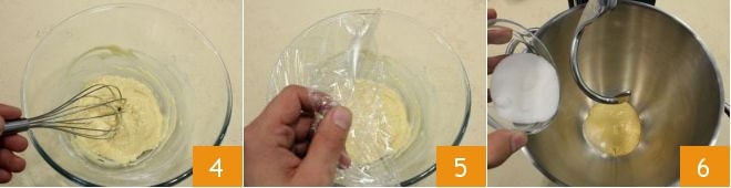 até obter uma massa homogênea 4; cubra com filme plástico 5 e deixe fermentar por 1 hora em temperatura ambiente até dobrar de volume. Após o tempo necessário, despeje na tigela de uma batedeira o fermento, adicione o açúcar 6