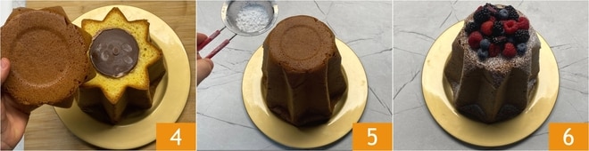 Recubra o pandoro com a tampa 4, em seguida polvilhe a superfície com açúcar de confeiteiro 5 e decore com frutas silvestres 6. Deixe o pandoro recheado com Sorvete de NUTELLA em temperatura ambiente por cerca de 10 minutos antes de servir e cortar!