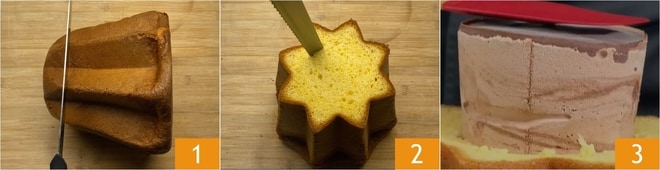 Para preparar o pandoro recheado com Sorvete de NUTELLA, primeiro corte a parte superior do pandoro a cerca de 3-4 cm de altura 1. Com a lâmina de uma faca longa e serrilhada, escave o interior do pandoro para criar uma cavidade aproximadamente do mesmo tamanho do recipiente de Sorvete de NUTELLA 2. Transfira o pandoro para o prato de servir, então retire o papel do sorvete e insira-o dentro da cavidade 3.