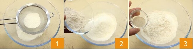 Para preparar o pão com patê de azeitonas, primeiro prepare a massa: peneire a farinha manitoba em uma tigela grande 1, adicione a farinha de espelta 2, o fermento biológico seco 3, o malte e misture tudo. Você também pode usar fermento biológico fresco (neste caso, a quantidade a usar é 12 g) e, em vez do malte, uma colher de chá de açúcar.