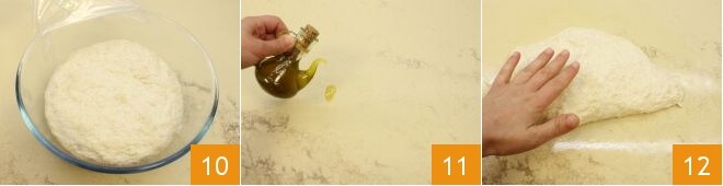 Quando a massa estiver bem fermentada 10, unte com azeite de oliva uma superfície de trabalho 11 e coloque o bloco de massa em cima 12, assim não grudará.