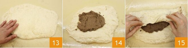 Achatá a massa: estenda em um retângulo 13 e recheie com o patê de azeitonas, espalhando por dentro e deixando alguns centímetros da borda 14, sobreponha os lados longos (15-16),