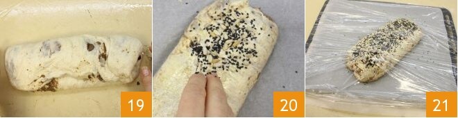 e depois enrole a massa pelo lado longo e dobre os lados mais curtos 19, para finalizar, estenda para dar a forma de um filão, selando bem as beiradas, as dobras são importantes porque dão o impulso certo à fermentação. Coloque o filão em uma assadeira forrada com papel manteiga, pincele o filão com um pouco de azeite e distribua por cima sementes de girassol e de gergelim preto 20. Cubra com filme plástico 21 e deixe fermentar por 1 hora no forno desligado com luz acesa.