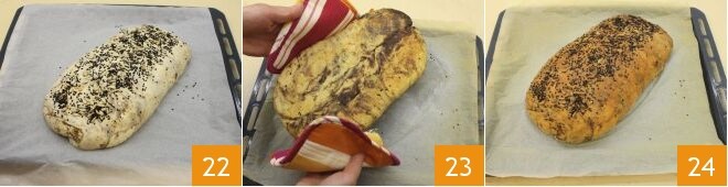 Após o tempo de fermentação 22, prossiga com o cozimento, coloque uma tigela cheia de água no fundo do forno para criar um ambiente úmido que ajudará no cozimento do pão, depois asse o pão em forno estático a 250° por 25 minutos, após esse tempo retire a tigela com a água e abaixe a temperatura para 200°, continue o cozimento por 10 minutos, depois vire o filão de cabeça para baixo 23 e asse por mais 10 minutos de cabeça para baixo. Quando estiver assado, retire o pão com azeitonas do forno e deixe esfriar 24.