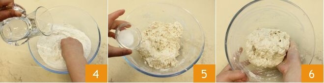 Adicione a água em fio 4 e comece a misturar os ingredientes com as mãos, no final adicione o sal à massa 5. Transfira a massa para a bancada 6.