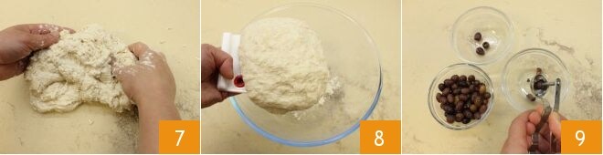 Continue a amassar com um raspador, pois a massa será bastante pegajosa 7. Continue até que fique lisa e macia. Coloque a massa em uma tigela, com o fundo ligeiramente untado com óleo 8, cubra com filme plástico e deixe fermentar no forno desligado com a luz acesa para criar um ambiente morno por 2 horas. Descaroce as azeitonas taggiasche com o utensílio apropriado 9 ou pacientemente com uma faca, retire a polpa ao redor do caroço.