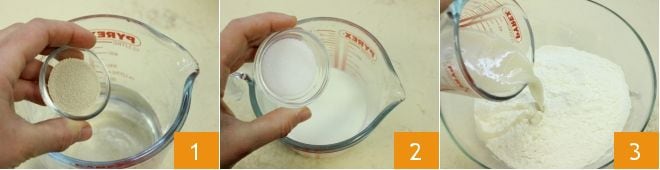 Para preparar o pão do Papai Noel, comece dissolvendo o fermento junto com a água morna 1, enquanto no leite morno adicione o açúcar 2 e o sal e misture para incorporar os ingredientes. Pegue uma tigela grande e despeje a farinha peneirada, depois adicione primeiro a água na qual você dissolveu o fermento 3,