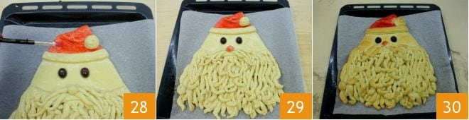 Com um pincel, pinte de vermelho o chapéu 28 e o nariz 29 e então asse o pão do Papai Noel em forno estático pré-aquecido a 180° por 35 minutos (se for ventilado a 160° por cerca de 25-30 minutos). Quando estiver assado, retire do forno 30, deixe amornar e saboreie para comemorar o Natal!