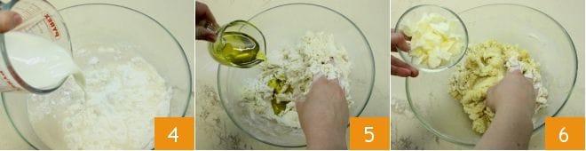 em seguida, despeje também o leite com açúcar e sal 4. Então comece a amassar e aos poucos despeje também o azeite de oliva 5 em fio. Quando o azeite estiver incorporado, adicione também a manteiga amolecida em pedacinhos 6 aos poucos, adicionando mais quando o anterior estiver incorporado.