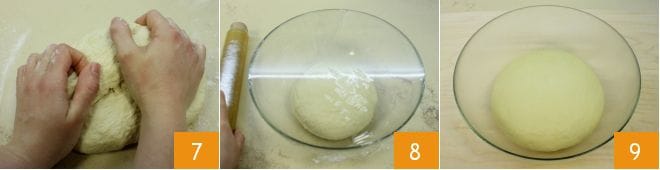 Amasse tudo na tigela, depois transfira a massa para uma superfície levemente enfarinhada. Manipule-a energicamente 7 até obter uma massa macia, homogênea e lisa. Forme uma bola, coloque-a em uma tigela, cubra com filme plástico 8 e deixe crescer em temperatura ambiente por algumas horas (ou até dobrar de volume) 9.