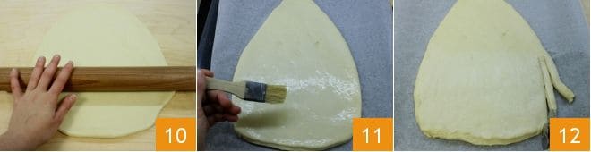Passado o tempo necessário, pegue a massa, divida-a em duas partes, uma de cerca de 900 g e a outra de 450 g. Estenda a maior 10 dando uma forma de triângulo de 36 cm de altura, com a ponta larga de cerca de 6 cm e a base de 23 cm, com cantos arredondados que representam a cabeça e o chapéu do Papai Noel. Estenda o triângulo de massa em uma assadeira forrada com papel manteiga e pincele com água 11. Em seguida, com um cortador de massa faça tirinhas de cerca de 1 cm de espessura ao longo de toda a base do triângulo 12.