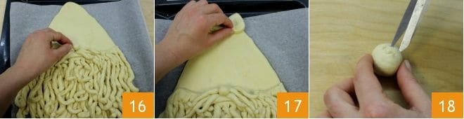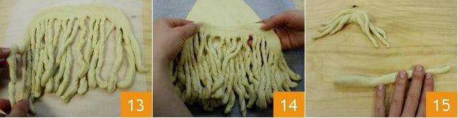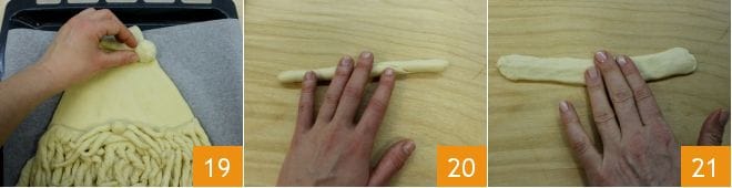 Da massa restante, tire um quarto que será usado para decorar, enquanto o restante estenda levemente e com o cortador de massa faça tiras de 1 cm de espessura sem cortá-las totalmente 13. Torça as tiras em si mesmas para dar movimento à barba e coloque-a em cerca da metade do triângulo, deixando espaço para a base do chapéu e os olhos 14. Com parte da massa restante, faça rolinhos de comprimentos diferentes que você pode unir para criar o bigode 15.