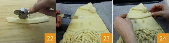 Refine a borda com um cortador de massa dentado 22, pincele a testa do Papai Noel com água 23 e coloque a base do chapéu 24.