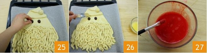 Crie os olhos com duas azeitonas pretas 25 e pincele todo o pão do Papai Noel com um ovo batido 26. No ovo batido que sobrou, adicione algumas gotas de corante vermelho até obter a coloração desejada 27.