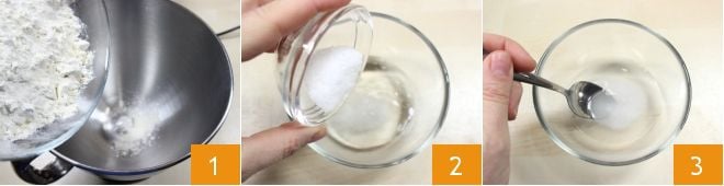 Para preparar o pão e salame, comece pela massa do pão: na tigela de uma batedeira ou em uma tigela grande se estiver amassando à mão, adicione a farinha manitoba e a farinha 0 peneiradas 1. Despeje um pouco da dose total de água em uma tigelinha, adicione o sal 2 e dissolva-o misturando com uma colher de chá 3. Se não encontrar a farinha manitoba, pode usar apenas farinha 0, preste atenção e escolha uma farinha 0 que contenha pelo menos 11% de proteínas, você pode verificar essa informação lendo as características do produto na embalagem. A farinha 0 e a manitoba, de fato, têm ambas um alto teor de glúten, mas se diferenciam pelo grau de refinamento.