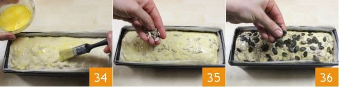 Pincele a superfície com um ovo batido 34 e polvilhe a gosto com sementes de girassol 35 e abóbora 36, pressionando para que adiram bem à superfície. Se quiser, você pode temperar seu pão e salame também com sementes de gergelim ou papoula. Caso contrário, deixe-o liso e adicione algumas gotas de leite ao ovo batido para obter uma superfície ainda mais dourada.