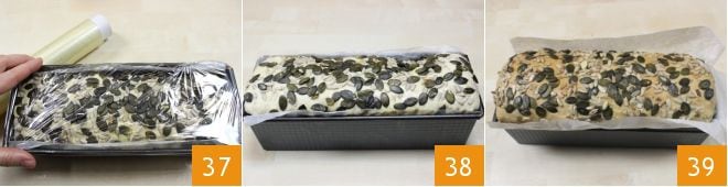 Cubra a forma com filme plástico 37 e deixe crescer por pelo menos 1 hora à temperatura ambiente, até que a massa atinja a borda da forma. Quando a massa estiver inchada e macia 38, remova o filme plástico e asse em forno estático pré-aquecido a 180°C por cerca de 45 minutos; se usar forno ventilado, asse a 160°C por cerca de 35 minutos. Uma vez assado, desenforme puxando as bordas do papel manteiga 39 e deixe esfriar em uma grade. Seu pão e salame está pronto para ser fatiado e apreciado durante um piquenique ou como entrada!