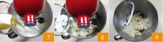 Monte a pá na batedeira e, uma vez ligada, adicione primeiro a água contendo o malte, o fermento e o óleo 7 e, em seguida, comece a amassar em velocidade média; se amassar à mão, misture vigorosamente os ingredientes. Após 1 minuto, adicione também a água na qual você dissolveu o sal 8, continuando a amassar. Quando a mistura se reunir em torno da pá, substitua-a pelo gancho 9 e continue amassando sempre em velocidade média-baixa por pelo menos 5 minutos, até que a massa esteja lisa e homogênea.