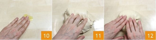 Após esse tempo, despeje um fio de óleo sobre uma superfície de trabalho 10, para que você possa amassar sem adicionar farinha, e depois transfira a massa para ela e comece a trabalhar com as mãos, até dar-lhe uma forma redonda (11-12).