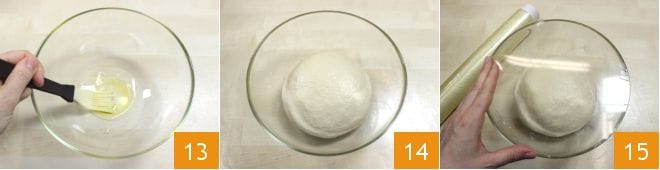 Então, unte uma tigela com a ajuda de um pincel 13 e transfira a massa para ela 14, cubra com filme plástico 15 e deixe levedar por pelo menos duas horas a uma temperatura ambiente entre 28 e 30°C ou até dobrar de volume.