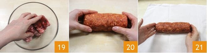 Depois de adicionar também as sementes de erva-doce trituradas, misture tudo à mão por 5 minutos 19, depois unte novamente a superfície de trabalho e transfira a mistura para ela, moldando-a à mão, formando um rolo de linguiça com cerca de 20 cm de comprimento e com forma cilíndrica 20. Em seguida, disponha-se de uma musselina ou de um pano limpo e coloque o rolo de linguiça sobre ele 21.