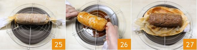 Após cozido, escorra o rolo de linguiça em uma grade 25, sob a qual você posicionou um prato, e esprema-o apertando as bordas da musselina 26, de modo que o excesso de água e gordura saia. Em seguida, abra a musselina ou o pano em que você envolveu a mistura e deixe esfriar à temperatura ambiente 27. É importante que o recheio não esfrie completamente, mas chegue à temperatura ambiente, caso contrário, a massa pode não crescer corretamente.