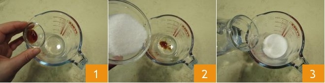 Para preparar o panetone, comece fazendo a primeira massa. Coloque em uma tigela o malte 1, os 65 g de açúcar granulado 2 e os 125 g de água em temperatura ambiente 3.