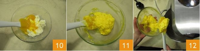Em seguida, adicione o restante 10 e misture novamente até obter uma emulsão homogênea 11. Neste ponto, adicione metade dela na batedeira em funcionamento 12.