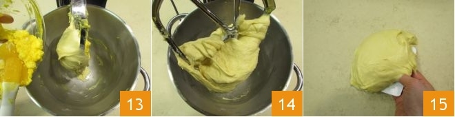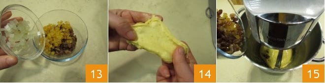 Neste ponto, escorra bem as passas e coloque-as em uma tigela, adicione também a laranja e o cedro e misture 13. Para garantir que a massa está pronta, desligue a máquina, retire uma porção e, se ao abri-la com as mãos ela estiver fina mas não se romper facilmente, significa que atingiu a elasticidade correta 14; se não for o caso, trabalhe a massa por mais alguns minutos, caso contrário, adicione a mistura de frutas cristalizadas e passas na batedeira 15 e ligue-a novamente em velocidade moderada.