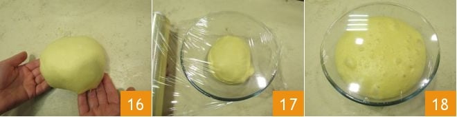Dê uma forma esférica à massa 16, transfira para uma tigela de vidro, cubra com filme plástico para alimentos 17 e deixe fermentar por cerca de 12 horas a uma temperatura de cerca de 26°C até que a massa triplique de volume 18. Enquanto isso, se preferir preparar em casa a pasta de tangerina, laranja ou limão, veja o box no final.