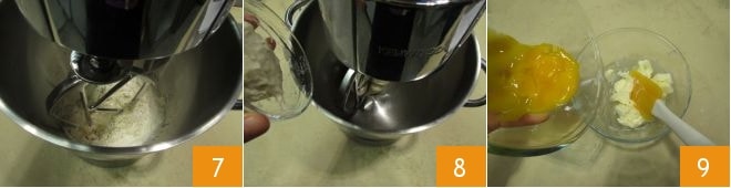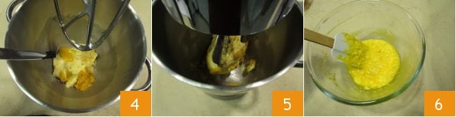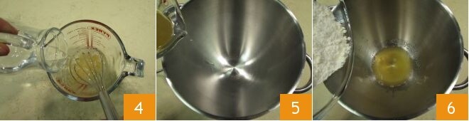 Misture com um batedor até que o açúcar se dissolva 4; em seguida, despeje a calda em uma batedeira equipada com um batedor tipo folha 5. Adicione então os 250 g de farinha manitoba de uma só vez 6 e comece a amassar.