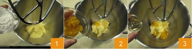Para a segunda massa do panetone, use uma espátula para soltar a primeira massa (fermentada) da tigela de vidro e transfira para a batedeira, ainda equipada com a folha. Adicione 65 g de farinha manitoba 1 e ligue a máquina em velocidade moderada até que seja completamente absorvida. Em seguida, adicione as massas aromáticas, ou seja, a pasta de laranja, a de tangerina e a de limão 2; adicione então o mel 3