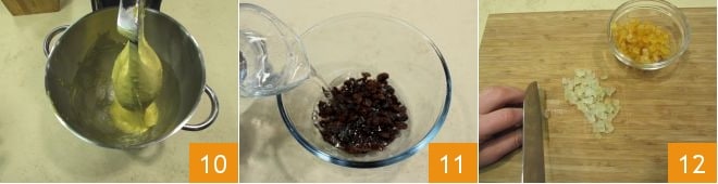 e finalize de trabalhar a massa, até que esteja bem trabalhada 10. Enquanto isso, coloque as passas de molho 11 e corte em cubos tanto o cedro quanto a laranja cristalizada 12.