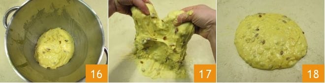 Quando a mistura de frutas cristalizadas e passas estiver bem incorporada, desligue a máquina, solte a folha e deixe a massa descansar por cerca de 20 minutos dentro da tigela da batedeira 16, cobrindo-a com um pano de prato. Depois, transfira para uma superfície, dê algumas dobras 17 e deixe descansar por mais 30 minutos em temperatura ambiente 18; não será necessário cobri-lo. Não se preocupe se a massa ficar um pouco grudenta, ajude-se a trabalhá-la usando uma espátula.