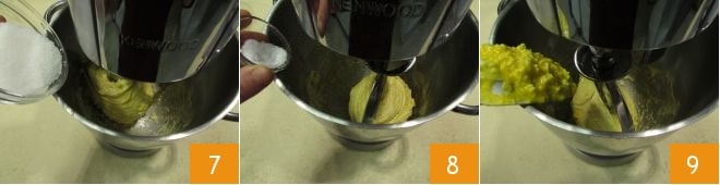 Para favorecer a absorção, use uma espátula para soltar a massa que ficou presa na folha e ligue novamente a batedeira em velocidade média. Quando a massa estiver bem seca e a manteiga tiver sido completamente absorvida, adicione o restante da emulsão de manteiga e gemas 13. Trabalhe novamente até obter uma massa lisa e homogênea 14, depois transfira para uma superfície de trabalho, ajudando-se com uma espátula 15.