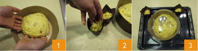 Após os 30 minutos, pegue 1050 g de massa, arredonde delicadamente para dar uma forma esférica e transfira para uma forma de papel de 1 kg (as dimensões exatas são 22 cm de diâmetro e 8 cm de altura) 1. Use a massa restante (cerca de 150 g) para preparar dois pequenos panetones usando formas de muffin 2. Aqueça o forno a 35°C, depois desligue-o, cubra o panetone com uma cúpula de vidro 3 e coloque o panetone e os pequenos panetones para fermentar no forno por 6-8 horas.