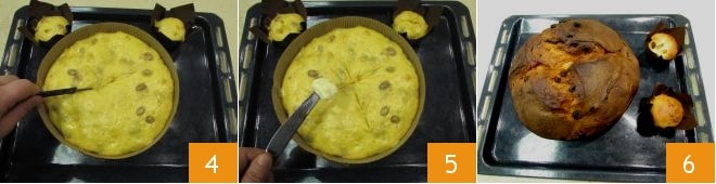 Uma vez fermentado, deixe-o descoberto em temperatura ambiente por cerca de 30 minutos, dessa forma se formará uma película fina na superfície. Com um estilete, faça um corte em cruz 4 e coloque uma noz de manteiga no centro da cruz 5. Asse a 175°C em modo estático por 50 minutos, após 20-25 minutos retire os pequenos panetones do forno e continue assando o panetone pelos minutos restantes. Depois, retire do forno