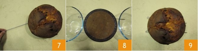 e espete-o com 2 espetos de aço nos dois lados externos 7. Deixe esfriar de cabeça para baixo durante toda a noite, usando duas panelas ou duas tigelas da mesma altura para fixá-lo 8. Na manhã seguinte, vire-o, retire os espetos e seu panetone estará pronto para ser degustado 9!