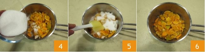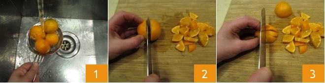 Se quiser, você pode fazer a pasta dos vários cítricos em casa. Para fazer a de tangerina, como primeira coisa, lave-as 1 e elimine as extremidades; então, sem descascar, corte primeiro ao meio 2 e depois em fatias que você deve dividir novamente ao meio 3.