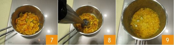 Neste ponto, coloque no fogo e cozinhe em fogo baixo por 35-40 minutos 7. Uma vez cozidas, deixe amornar e triture tudo com um mixer de imersão 8, até obter sua pasta de tangerina 9.