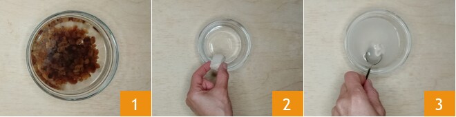 Para realizar o pangiallo romano, primeiro deixe amolecer as uvas passas em 300 g de água morna por 30 minutos 1, depois escorra o excesso de água. Dissolva 10 g de fermento biológico em 40 g de água morna 2 mexendo com uma colher de chá 3.