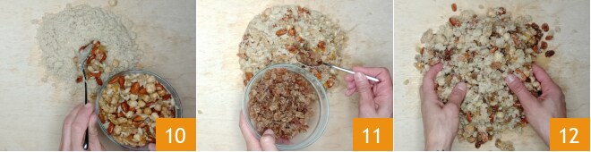 Adicione a fruta à massa 10, incorpore também as uvas passas bem escorridas 11 e amasse à mão 12.