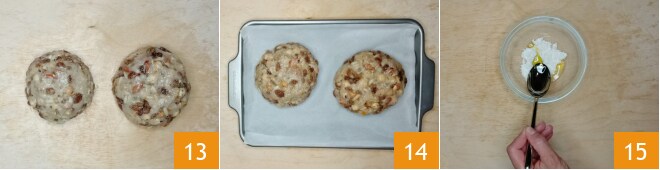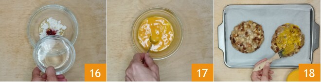 o açafrão e a água 16, misture com uma colher 17 e pincele os pães com a pastela obtida 18.