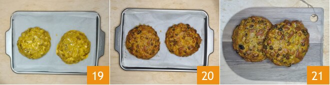 Devem ficar bem glaceados em toda a superfície 19. Asse em forno estático pré-aquecido a 170 °C por 45 minutos. Após o término da cozedura, retire o pangiallo do forno 20 e deixe-o esfriar antes de degustar 21.